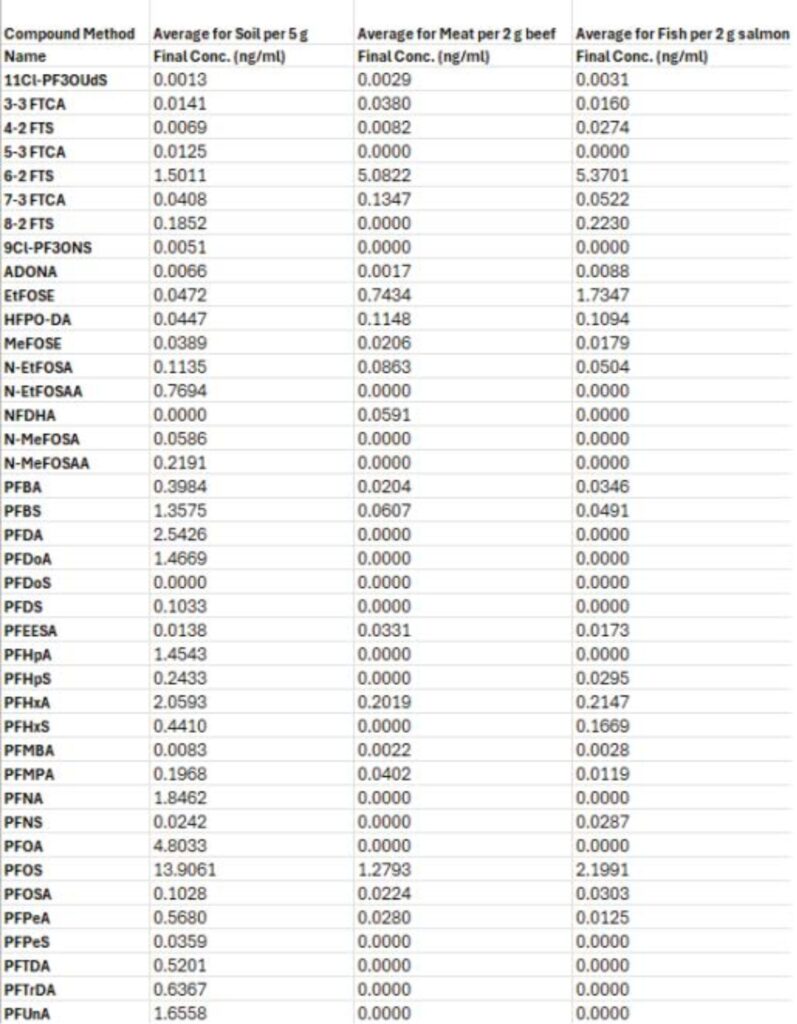 PFAS Concentration Data for Soil, Meat & Fish Samples